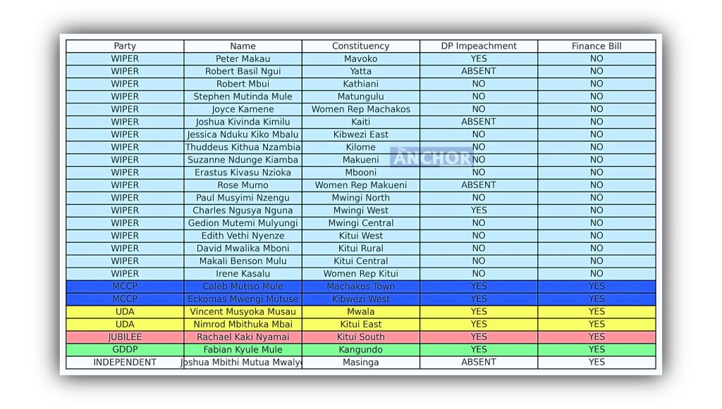 The voting trends between the finance bill and the impeachment of the deputy president within the Wiper Democratic Party in ukambani tell a story of a rift in allegiances. Charles Ngusya Nguna, the representative for Mwingi West, voted “Yes” in the impeachment proceedings alongside Patrick Makau from Mavoko in Machakos County.