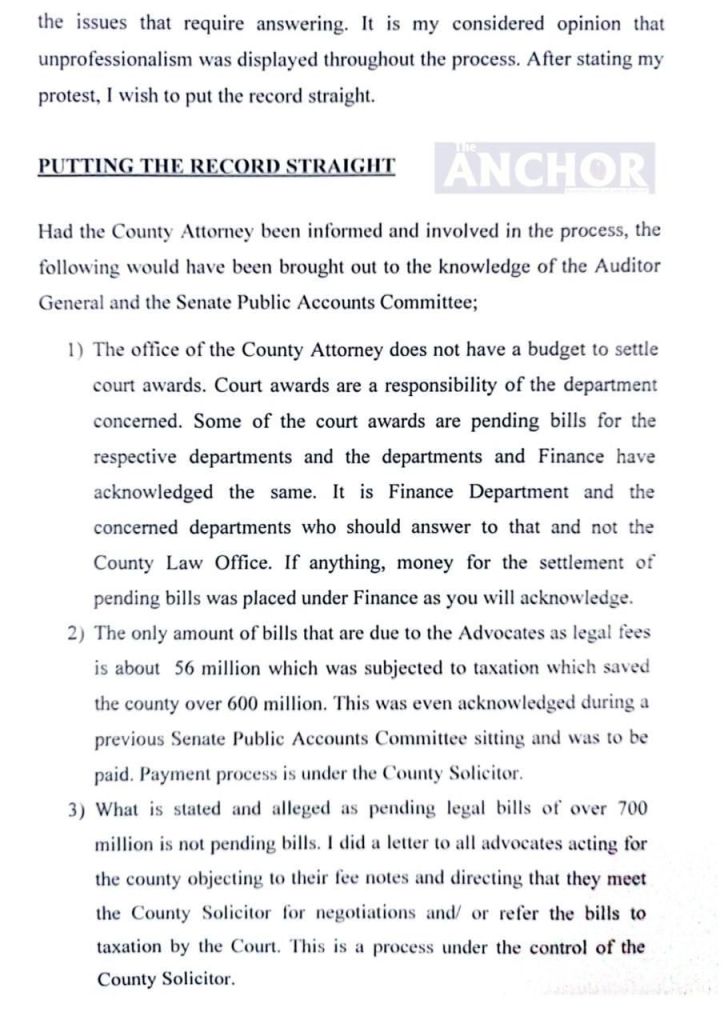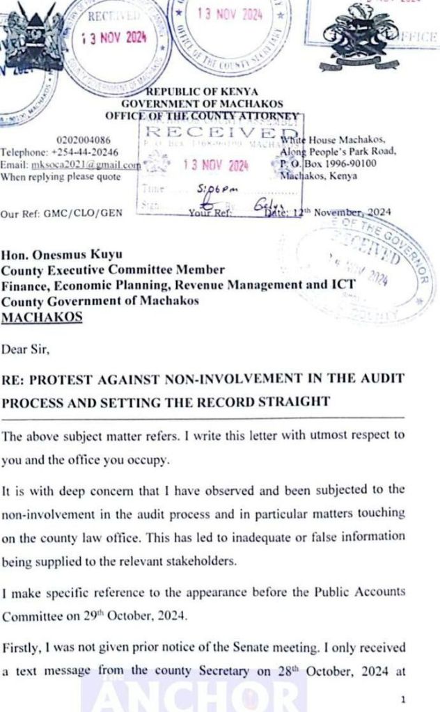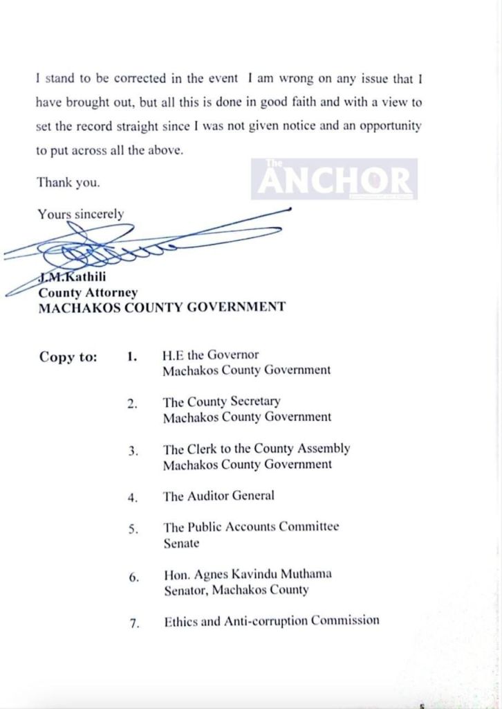 The revelations come in the form of a protest letter dated November 12 by the County Attorney Mr. James Kathili who resigned Yesterday.