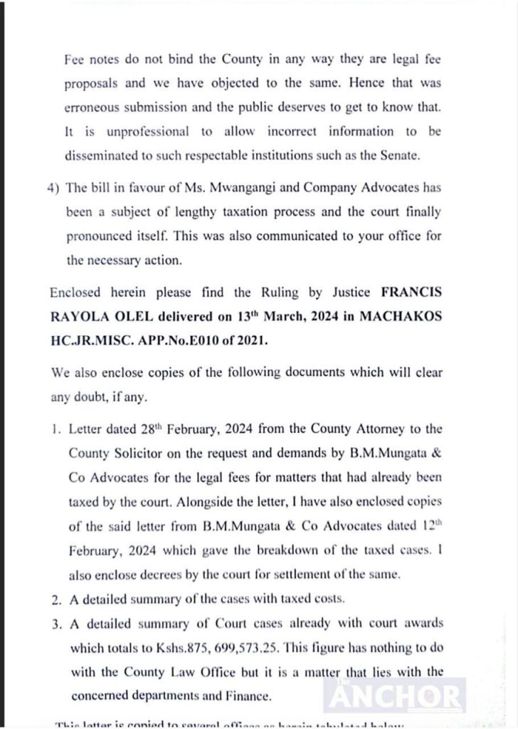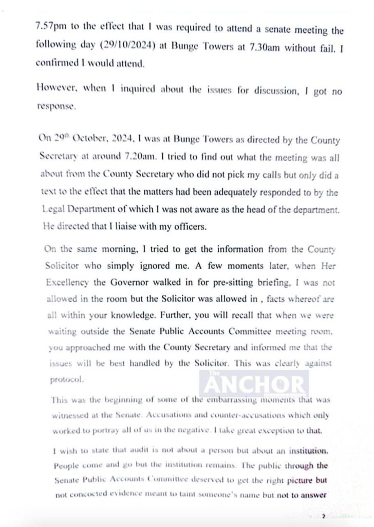 So as she steps into the room this time round, the Senate will be holding a protest letter written to the Finance Minister Onesmus Kuyu, detailing how the finance minister handles the audit process to the exclusion of the County Attorney.