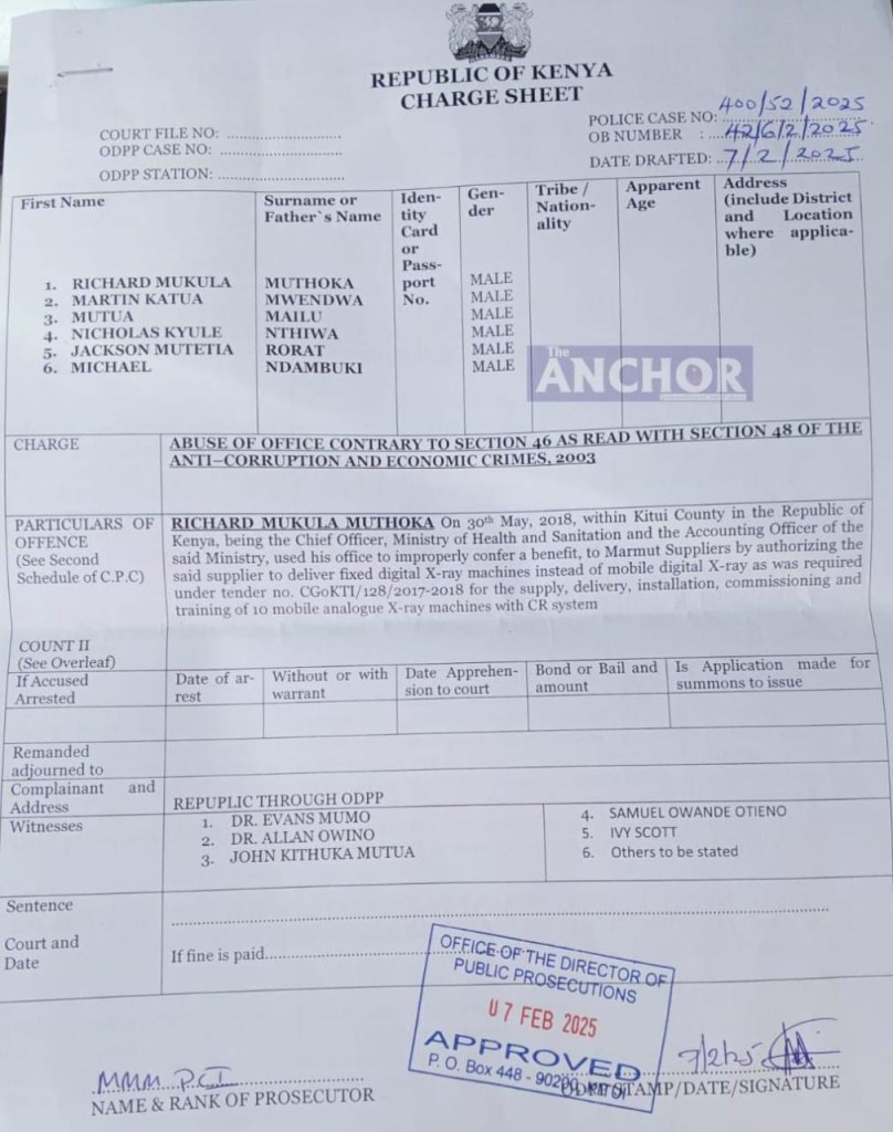 Former Kitui Health Chief Officer Richard Makula Muthoka and five others were arraigned today, facing six counts of abuse of office. The charges stem from the delivery of incorrect X-ray equipment worth KES 56 million.