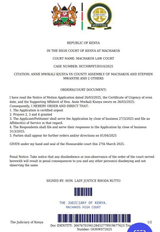 Justice Ruto granted an injunction against the County Assembly, the Clerk, the Deputy Speaker, and Nzioka, ordering them to file their responses to Mrs. Kiusya’s pleadings by March 31, 2025. Kiusya was instructed to serve them with suit documents.