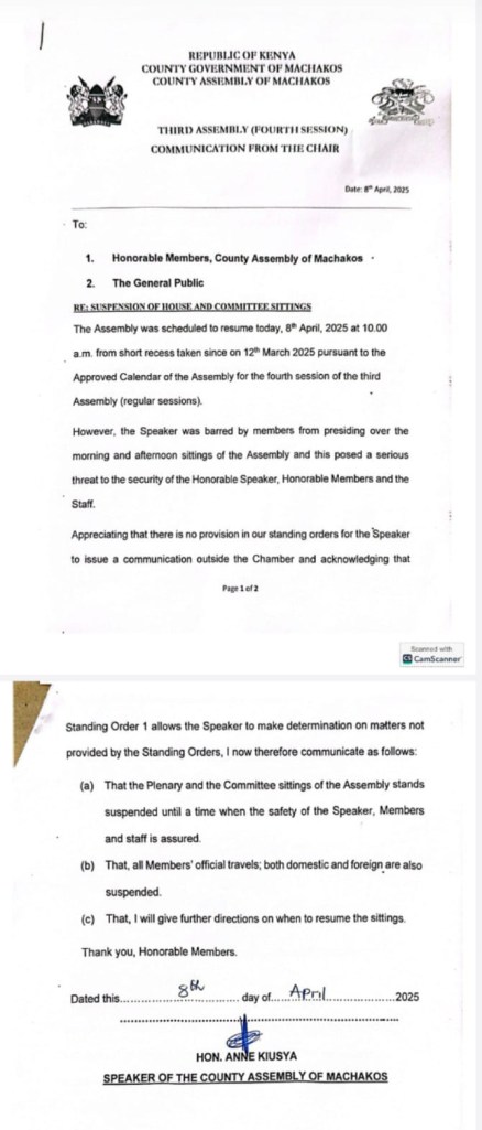 The Machakos County Assembly descended into chaos yesterday as a vicious power struggle over the fate of Speaker Anne Kiusya erupted into violent confrontations, forcing the indefinite suspension of the Assembly.