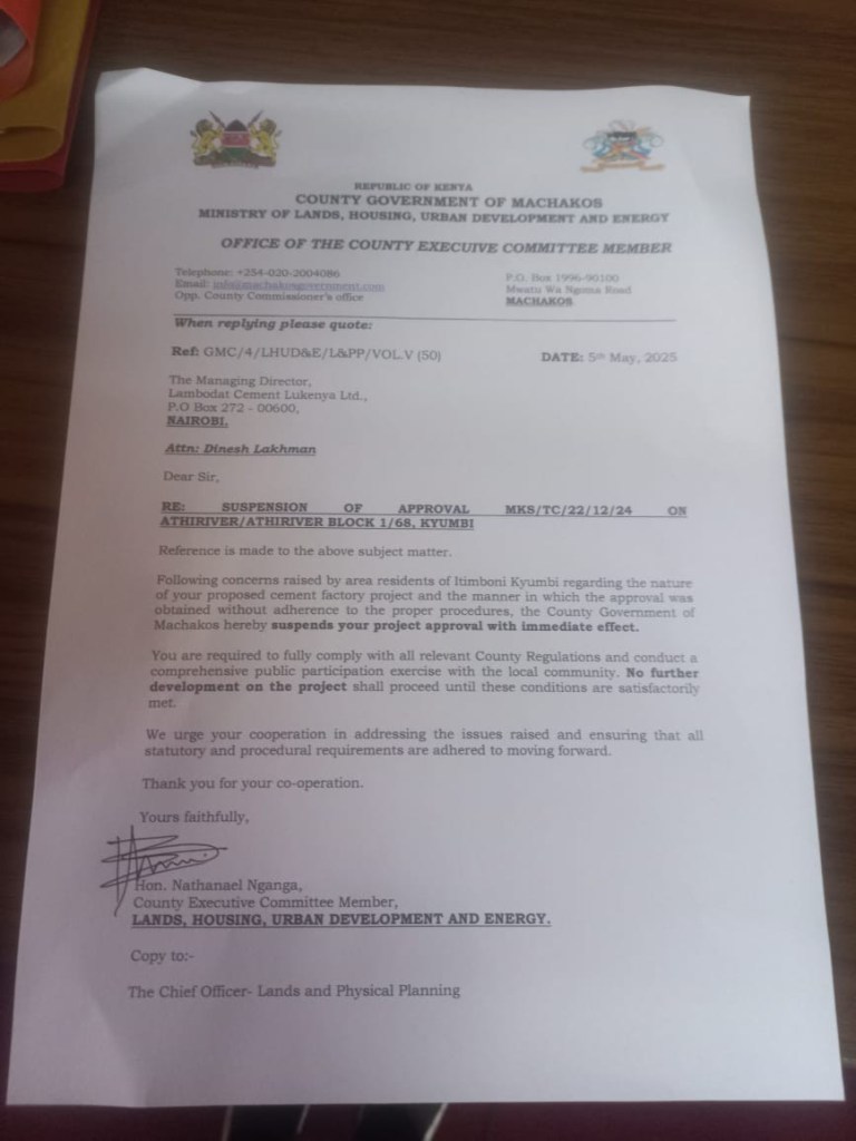 In a letter issued yesterday, County Executive for Lands, Housing, Urban Development and Energy, Nathaniel Nganga, directed Lambodat Cement Lukenya Limited to cease all construction activity.