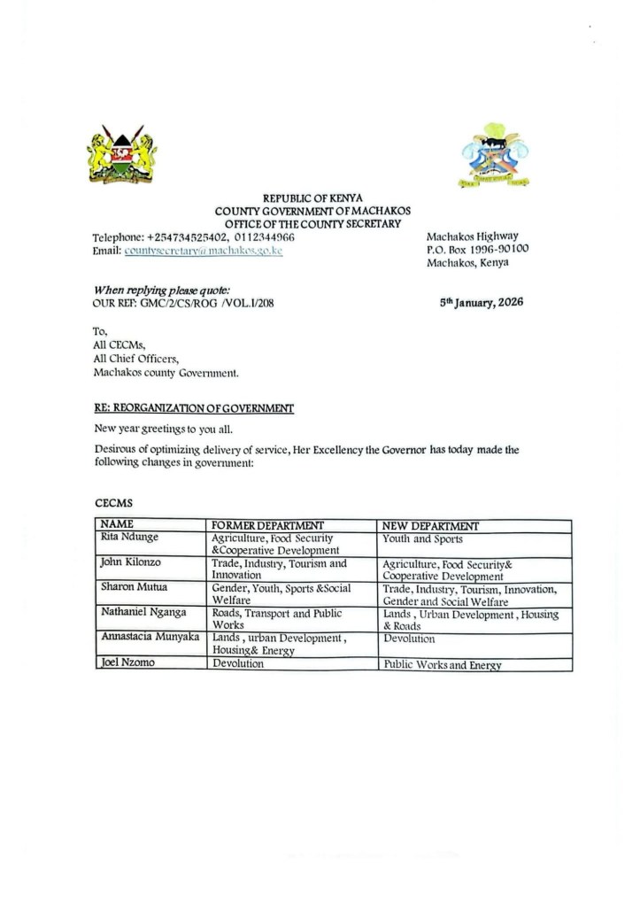 The reshuffle also involved the movement of entire departments across ministries, signalling an undeclared reorganisation of county government.
